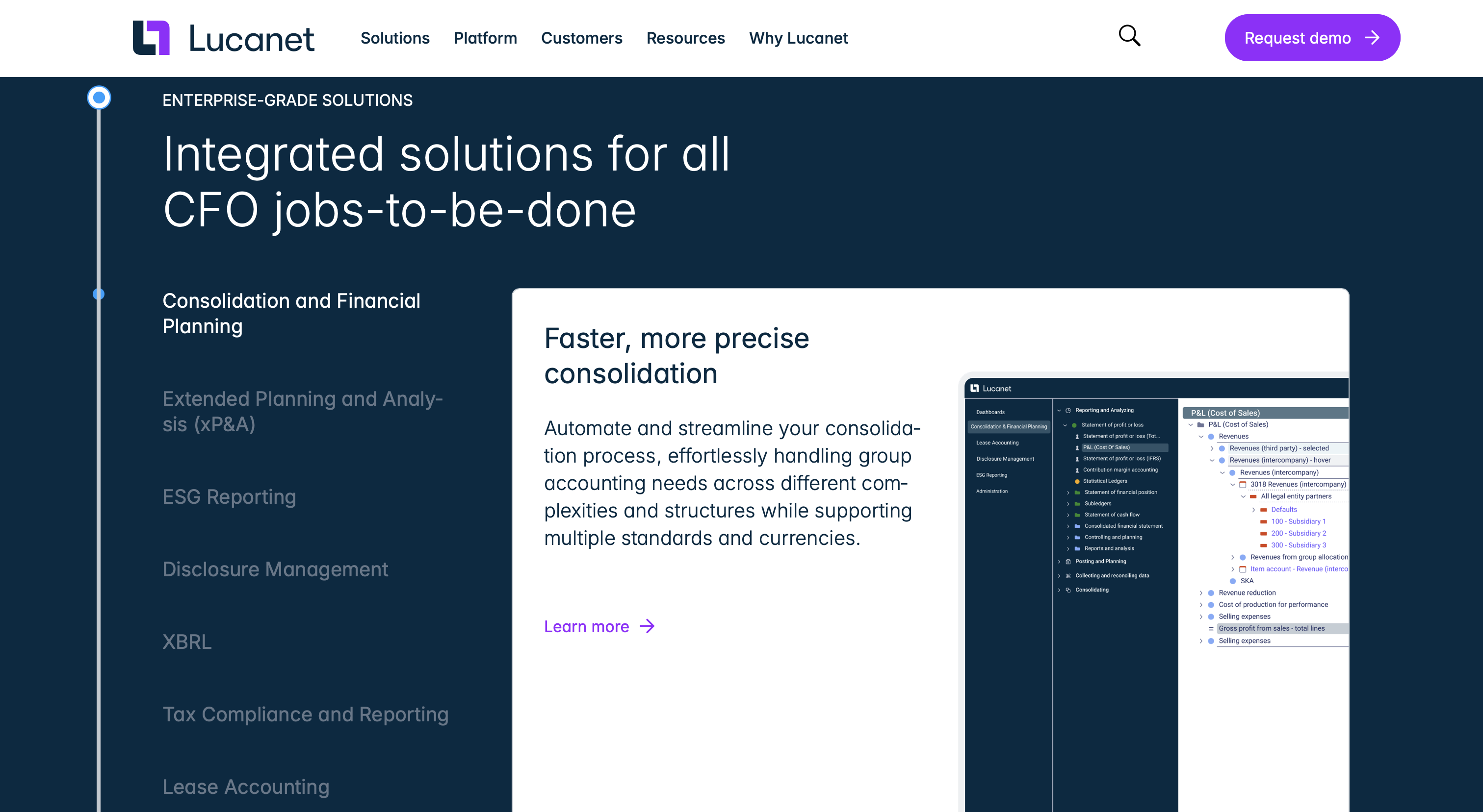 Lucanet organizes its homepage around what CFOs need to accomplish, not around what the product does. Instead of “consolidation features” or “reporting capabilities,” the homepage lists actual CFO and finance team responsibilities: IFRS 16 lease accounting, Pillar 2 tax compliance, ESG reporting. This jobs-to-be-done structure lets buyers immediately find their specific mandate and evaluate whether Lucanet handles it. No translation of product capabilities is required.