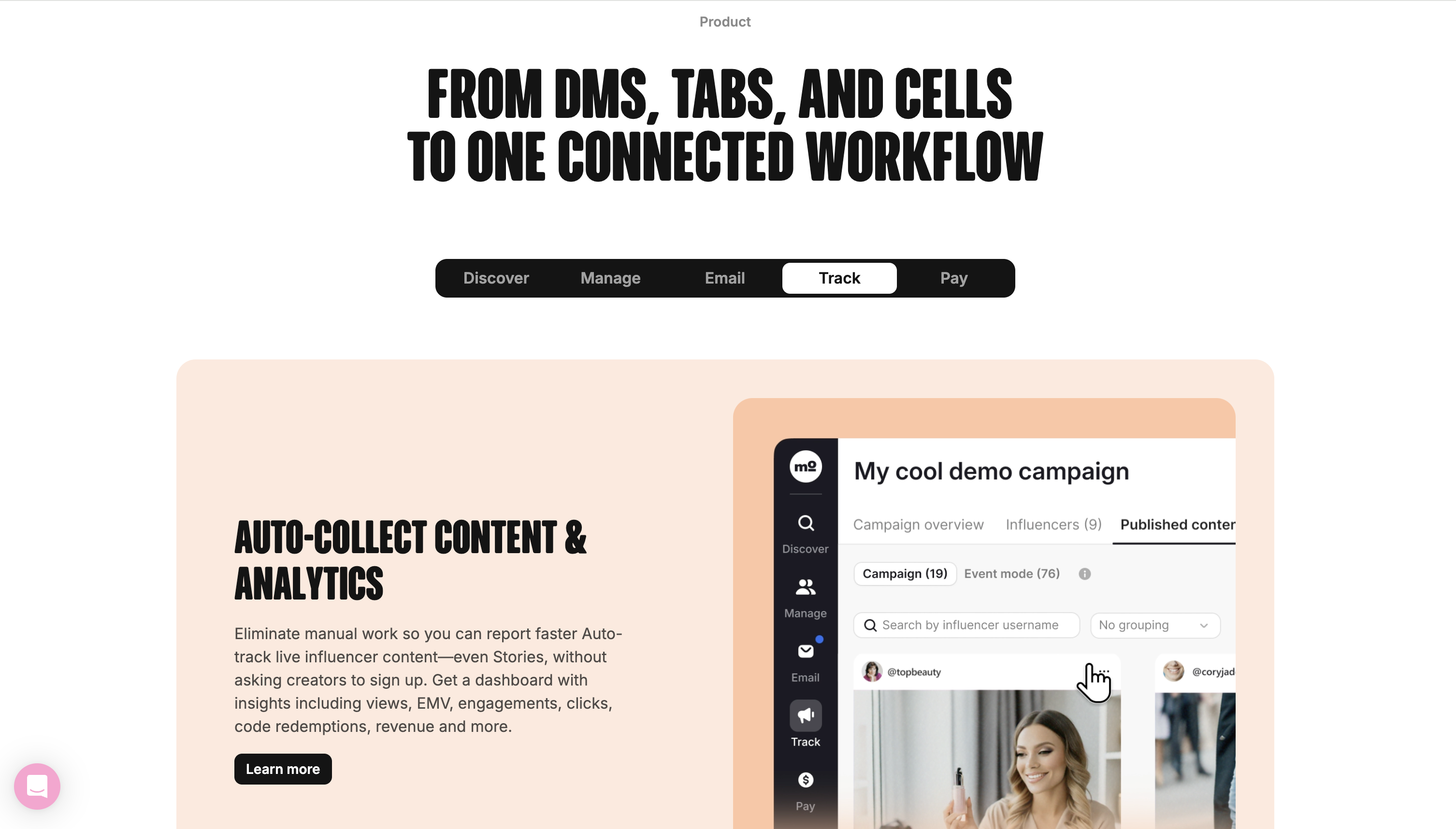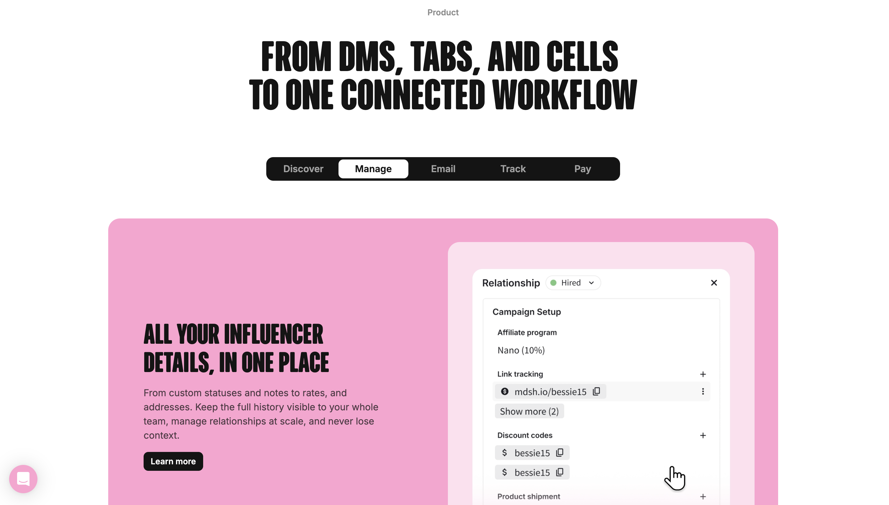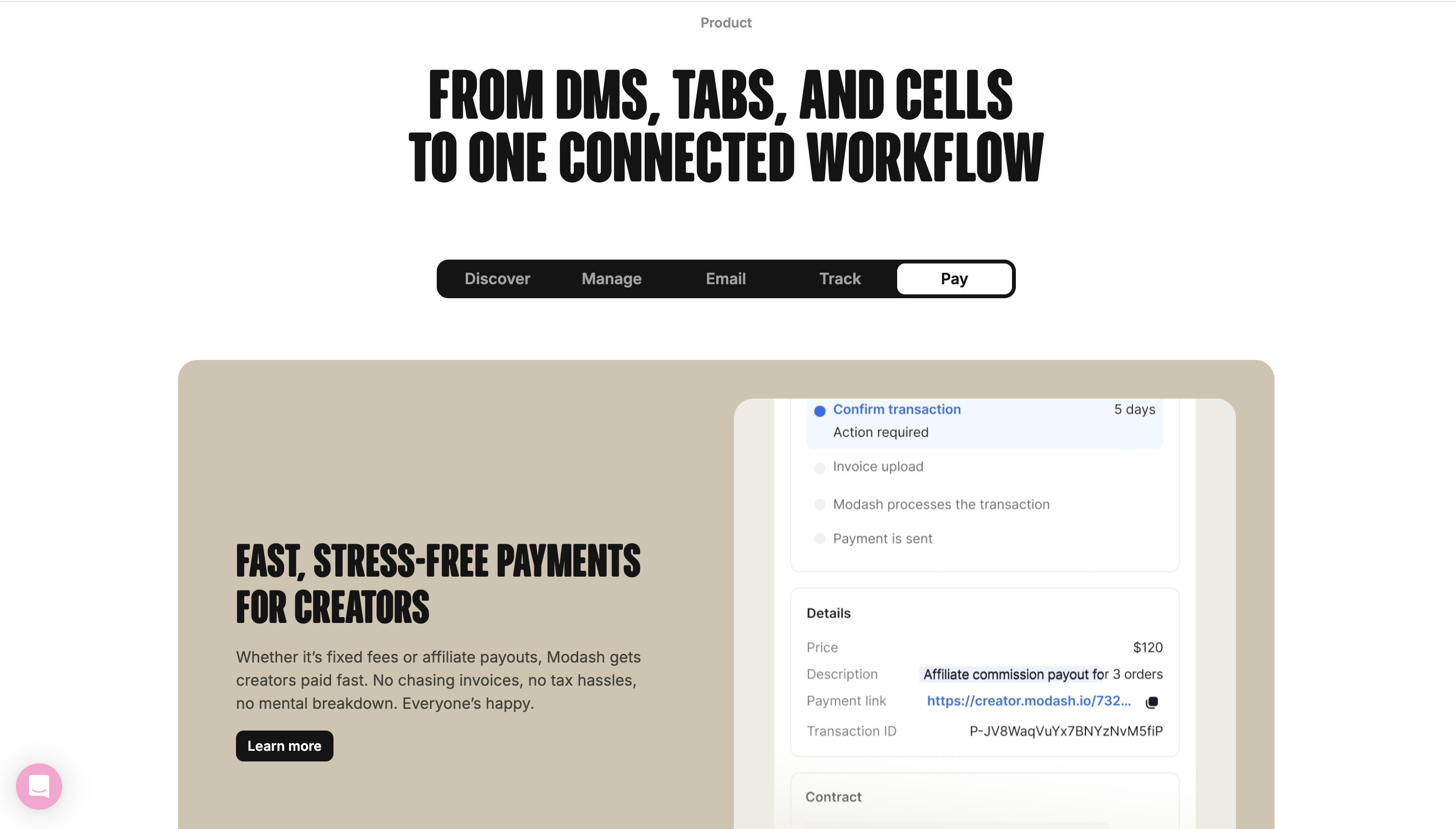 Modash organizes its homepage messaging around the real tasks users perform: discover, manage, email, track, pay. This lets buyers instantly see how the product fits their daily work, making product discovery and evaluation easy.